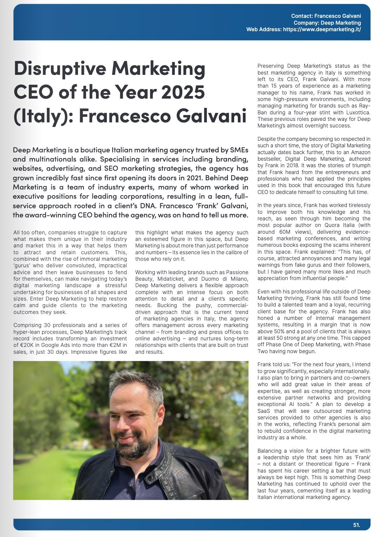 Francesco Galvani è stato nominato "Disruptive Marketing CEO of the Year 2025 (Italy)" da EU Business News.